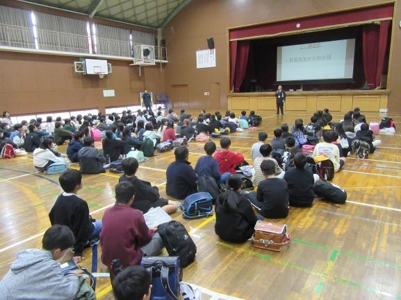 体育館では中学校の校長先生や生徒会長からの話があり、少し緊張した面持ちで聞いていました。