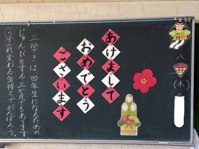さあ、、3学期 公開日 2026/01/07 更新日 2026/01/07 校長より 明日からいよいよ3学期が始まります。気持ちの準備はできたでしょうか?今日は昨日までより少し早く寝て、元気な姿で登校してほしいと教職員一同思っています。写真はある学年の黒板です。そんな気持ちが伝わってきませんか。