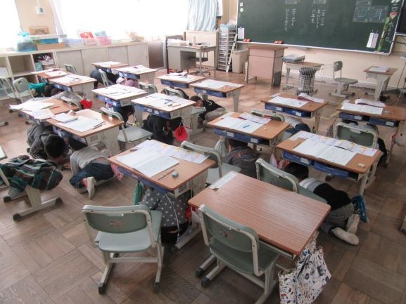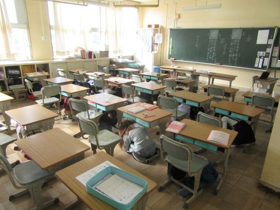 静かに机の下に避難していました。(写真は1・2年生の教室)