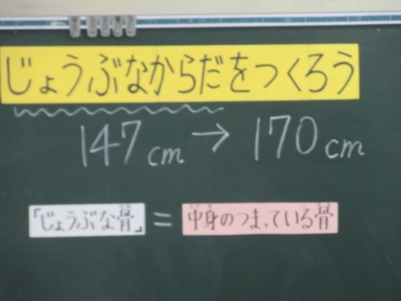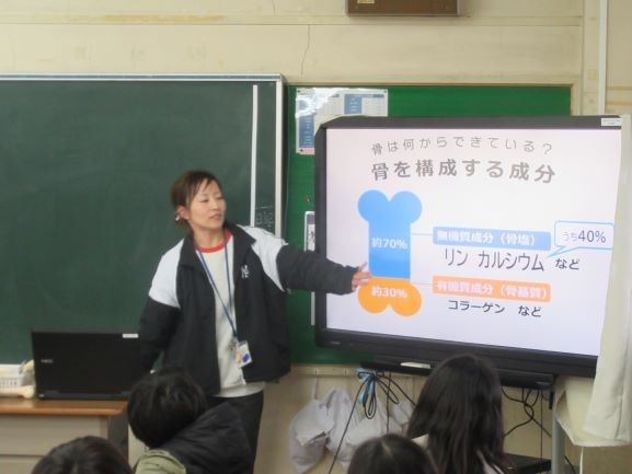 カルシウムの大切さ 公開日 2026/02/25 更新日 2026/02/25 校長より 5年生で「じょうぶな体をつくろう」をテーマとした食育の授業がありました。カルシウム不足になると骨がスカスカになり、折れやすいなどの影響が出ることなどを知り、規則正しい生活やバランスのいい食事などについて学びました。わたしも知りませんでしたが、なんと給食には一日に摂取すべき半分のカルシウムが含まれているそうです。残さず食べましょう!