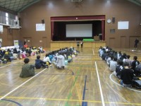 20分休みに、3年生が体育館前にある池で何かを探しています。