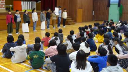 今日の児童朝会ではたんぽぽ学級の劇発表や放送委員会からのお知らせ、短縄とびの表彰を行いました。たんぽぽ学級は31日(金)に松原テラスでの「なかよしのつどい」で今日の劇を披露します。各学年から応援する感想をたくさんもらっているので、自信をもって披露してくださいね。
