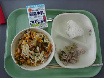 今日の給食のメニュー 牛乳、おにぎり、肉野菜いため、しょうゆラーメン