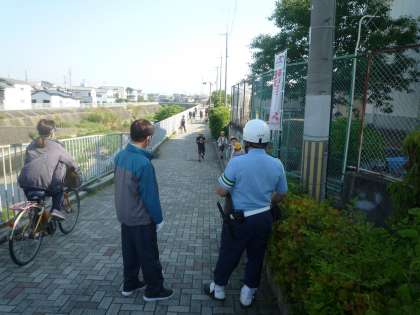 今朝は、松原警察の方と一緒に朝の挨拶をしました。