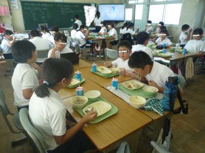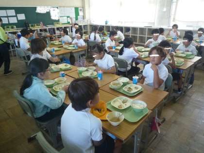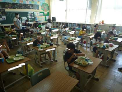 今日の給食タイムは、1・3・5年生です。楽しく食べてますよ。