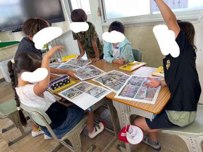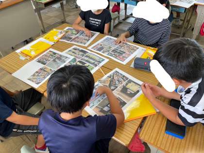 社会科の学習でスーパーマーケットの売り場のくふうを探しました。写真を見て、「大きな看板があるよ」「野菜やフルーツが切ってあるね」「お買い得と書いてあると買いたくなるね」「車椅子や子供用のカートもあるね」など、話しながらたくさんの工夫を見つけることができました。