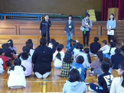 児童朝会がありました。朝会に、松原わんわんパトロール隊の皆さんが来てくれました。わんちゃんの散歩中に地域の見守りもしていただいているみなさんです。