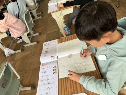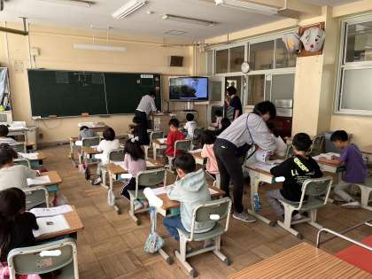姿勢を正してね。えんぴつの持ち方は・・。 一生懸命書いています。