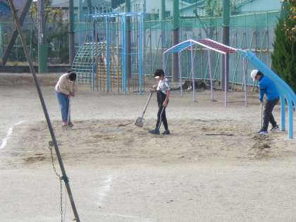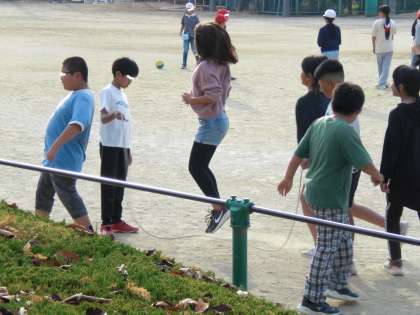 5年生は、八の字跳びの練習です。 砂場では、体育委員さんが耕してくれています。体育委員さんありがとう。