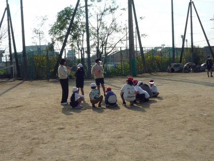 縦割り班での大繩。 跳び終わった後のふり返りを 班のみんなでしています。