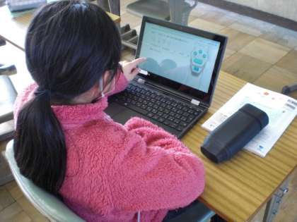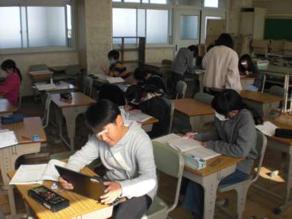 説明の仕方を考えるのに苦労しています。 できた人は、タブレットを使って分数の復習をしています。