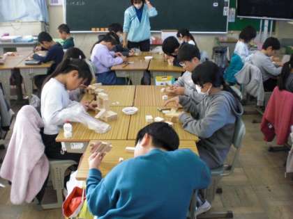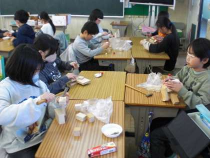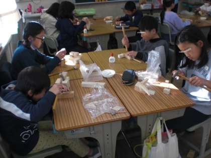 前回のこぎりで切った木を使って、ロボットを作っています。