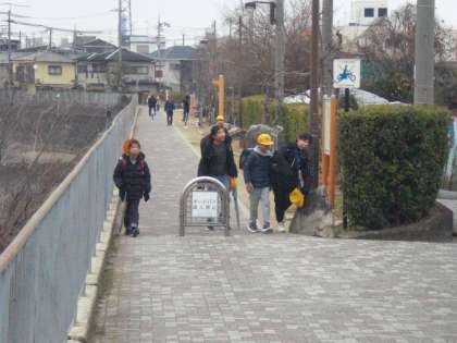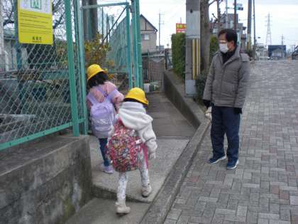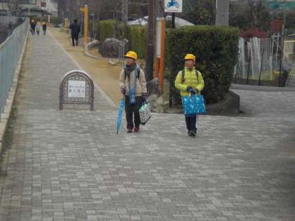 笑顔でおしゃべりしながら登校。 川の何かを見ながら登校。 大きな荷物をもって登校。 みんなとても元気です。