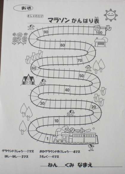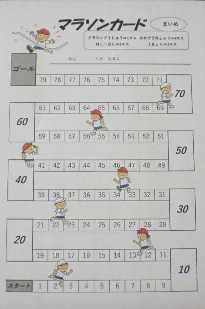 今日からマラソン練習が始まりました5 公開日 2024/01/11 更新日 2024/01/11 学校だより 走ってマスを埋めていきます。 低学年用 中学年用 高学年用 3種類あります。 無理せずに、コツコツ走りましょう。
