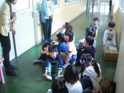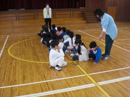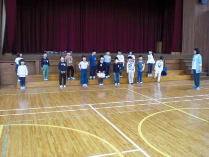 体育館では、対面式の練習をしています。 職員室では、入り方の実践をしています。