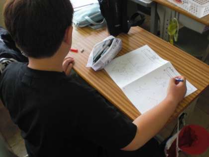 「線対称な図形を書くにはどうすればいいのか」の課題に対してじっくり取り組んでいます。