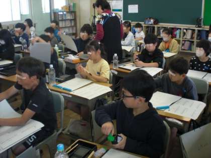 習字で「花」を書いています。打ち込みや払いの練習をしています。みんな真剣です。