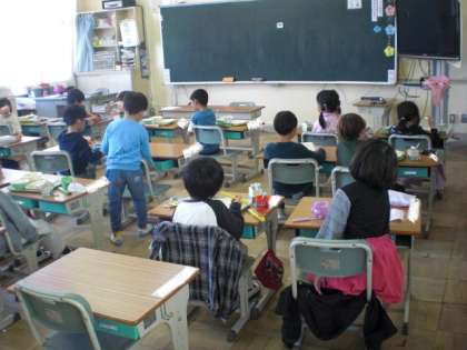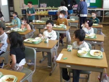 美味しい給食と楽しい雰囲気を一緒に食べています。