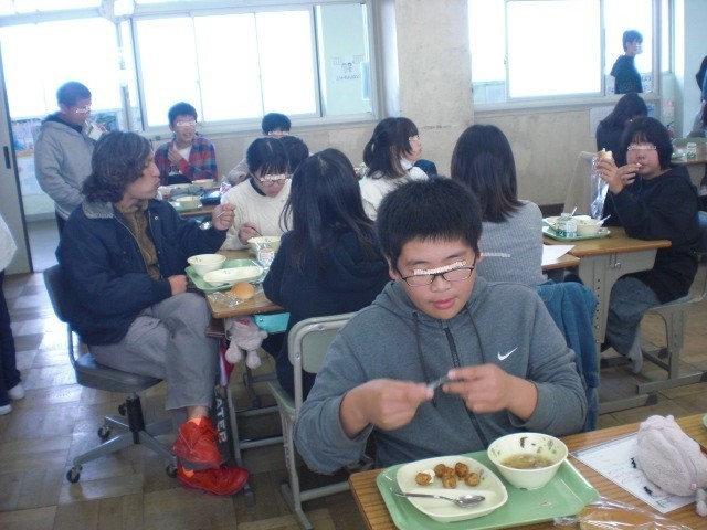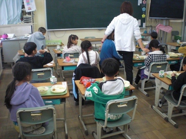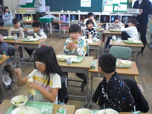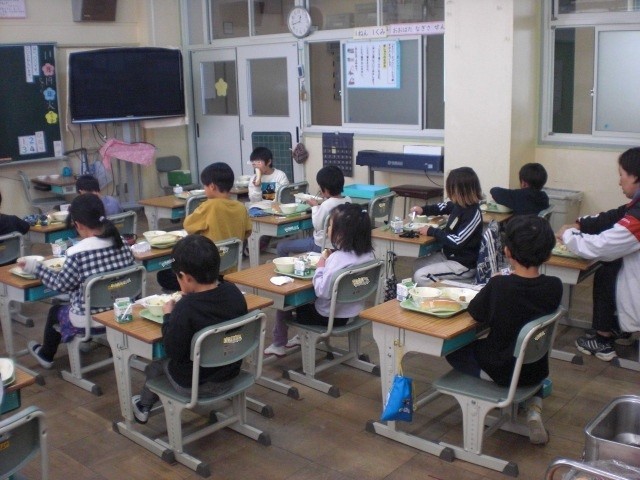 1・2・6年生は、元気に給食食べています。