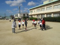 運動場でいくつかの学年が大縄跳び練習。1年生は6年生のお姉ちゃんに回してもらって...