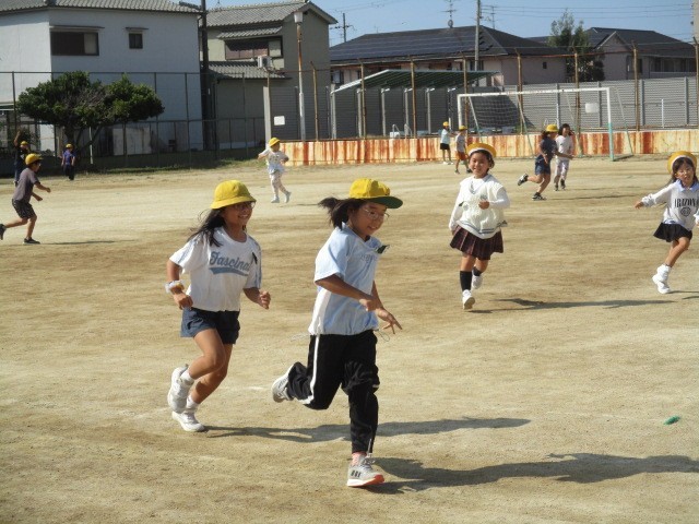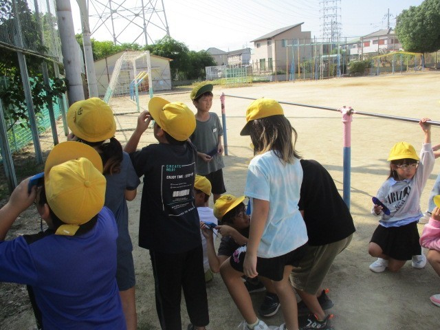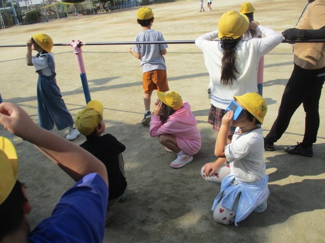 3年生が遮光板で太陽を見ています。遮光板で見ると、全然目を痛めることなく太陽を見ることができます。そして、自分と太陽の反対側に影ができます。その影を確認して、さあ、「影踏みおに」の始まりです!