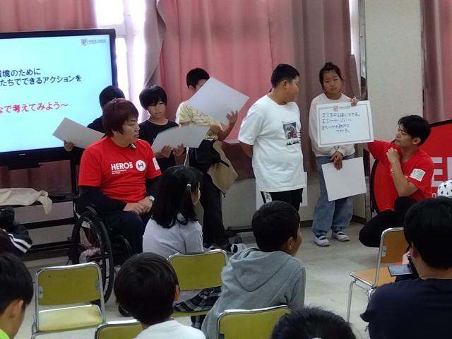 HEROsとは、アスリートの社会貢献団体です。今日は、シドニーパラリンピック車いすバスケットボール日本代表キャプテン根木慎志さんとフィギュアスケートの小塚選手に来ていただいて、プラスチックを中心に環境問題について考えました。最後に環境を守るために何ができるのかをグループで考えました。5年生で希望者は、根木さんといっしょにまつばらマルシェでゴミステーションボランティアに取り組みます。