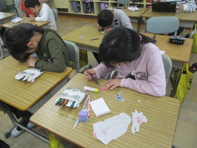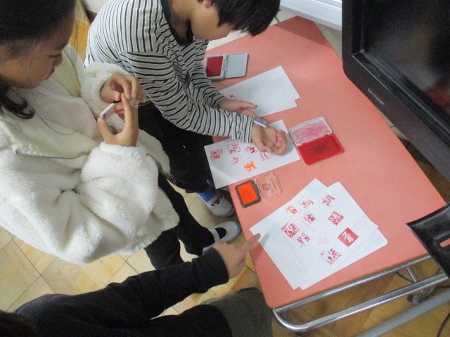 字を彫るべきか、周りを彫るべきか、考えながら彫りました。彫刻刀に慣れていないのでちょっと難しそうでした。それでも、完成させて自分でハンコを押してみて、満足するハンコになったかな?