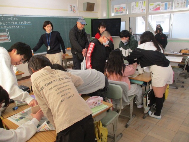 1組は、理科で地層のモデルを作っています。なかなかきれいに地層ができていましたよ。