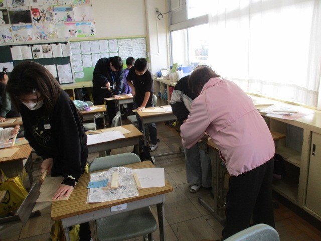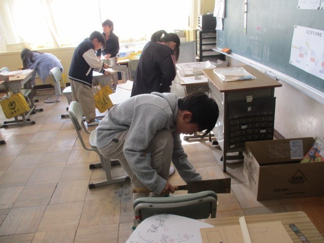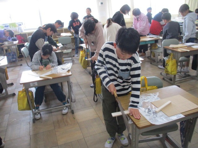 4年生の木工工作は、初めてのこぎりを持つ子もいて、てんやわんやでした。なかなか上手に切ることが難しくって、でも子どもたちはノリノリで楽しそうに木に向かっていました。