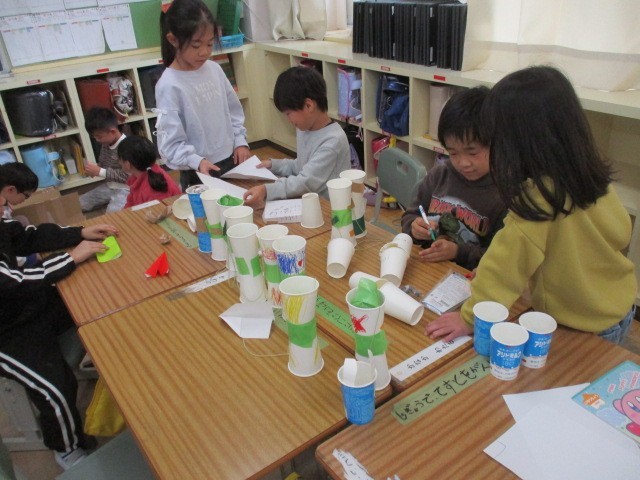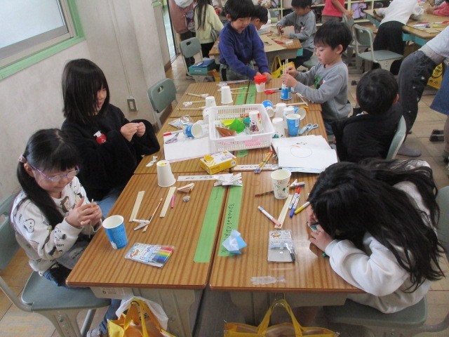 ストラックアウトやけん玉、わりばし鉄砲などたくさんの遊びを考えてカリーノ保育園のお友だちを待っています。そして、ありがとうの気持ちを込めて、お土産も作っていましたよ。