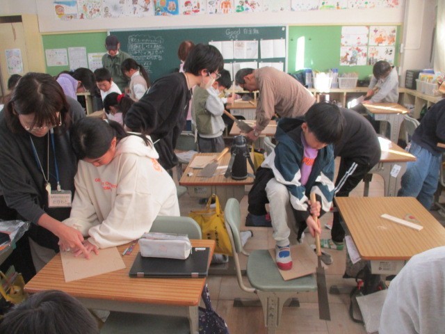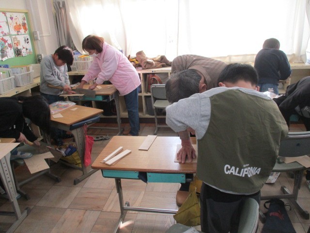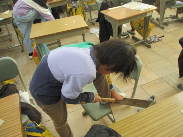 なかなかのこぎりで板を切るのは難しい。でも、今日は4人のサポーターの人たちが集まってくれたので、先生方も含めて、最大8人の大人が入り木工工作に挑みました。