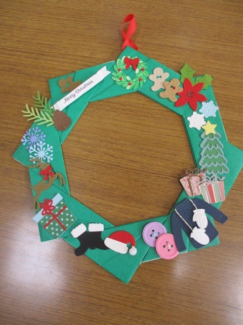 今、職員室前ドアにクリスマスリースを飾っています。これは、毎年3年生がお世話になっている視覚に障がいのある林はるみさんから頂いたものです。リースの枠を林さんが作って、姪っ子さんがかわいい飾りを貼ってくれたそうです。