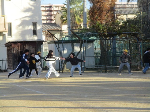 ISS子ども会議で決まった校区朝遊び大会の1回目をしました。6年生の遊びに三中生徒会の人たちが来ていっしょに遊ぶのです。三中生も必死で走ってケイドロをしたり、真剣にサッカーをしたりしてくれてすごく盛り上がりました。明日もありますので、今日来れなかった人は明日がんばって来てください。