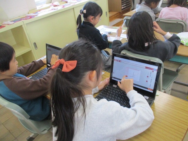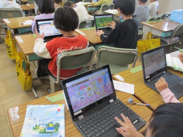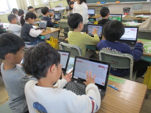 松原市では、「タブドリLive」というAIドリルを使っています。1年生の子どもたちは、足し算引き算をしたり、漢字やカタカナの練習をしています。AIが正しく書けているかどうかを判断して丸付けをしてくれます。みんな、楽しみながら学習をしています。