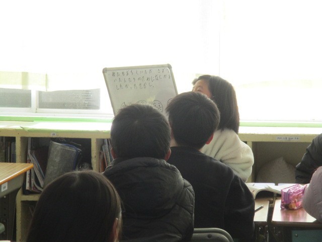 やなせたかしさんは、東日本大震災の時、被災地の子どもたちを元気づけるため、アンパンマンの応援イラストや「アンパンマンのマーチ」を被災地に届け、被災地で多くの人々を励ましました。そんなやなせさんの話を読んで、班で考えたやなせたかしさんについて交流しました。
