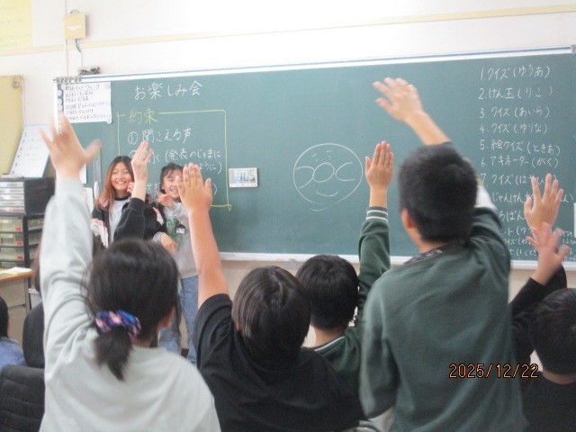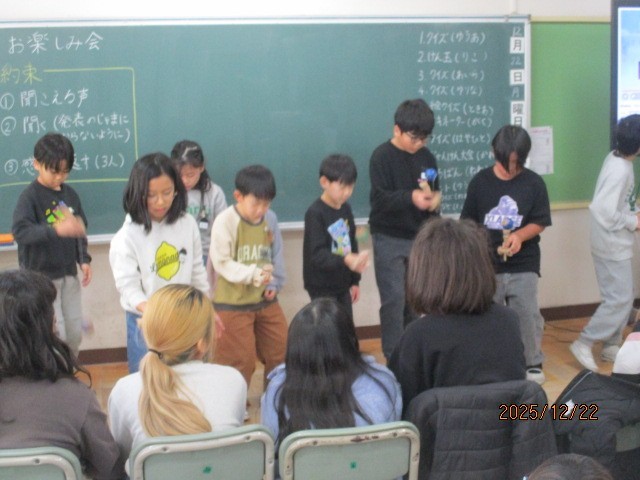 短い時間で絵を描いて、その絵を当てるクイズやけん玉披露がありました。他にもいっぱい企画していました。企画が終わればその感想を言うのがよかったです。