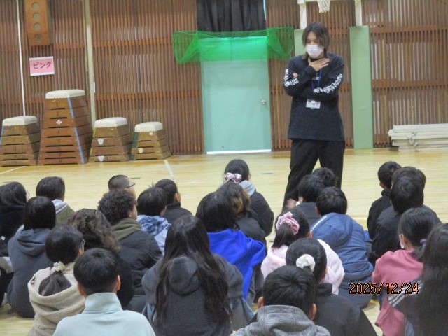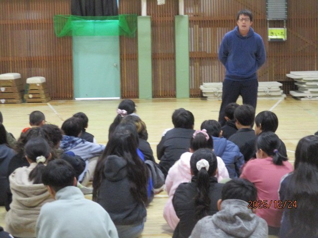 終業式の後、6年生は学年集会をして、2学期の振り返りと冬休みの学習のこと、決まり等生活のことを子どもたちと確認しました。