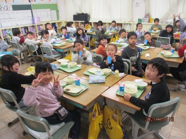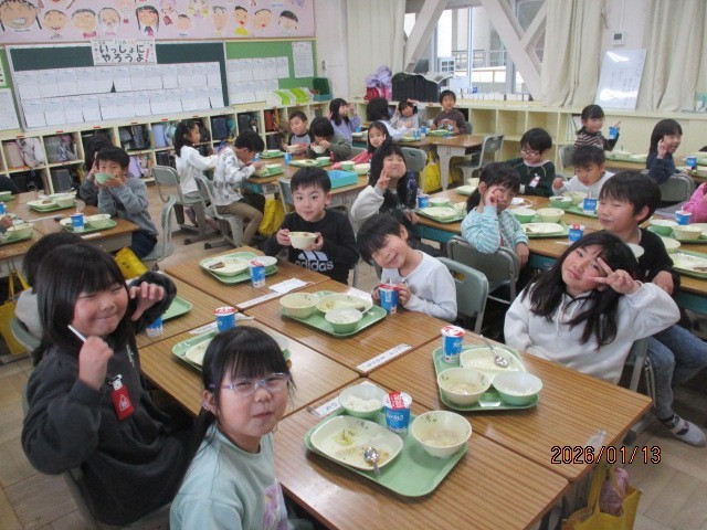 3学期最初の給食は、白みそ雑煮、塩ポン酢あえ、鰆の照り焼き風、ご飯、飲むヨーグルトでした。お正月に一番近い給食なのでお雑煮が出ました。子どもたちも大満足でした。