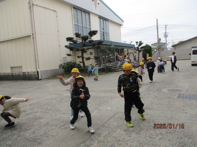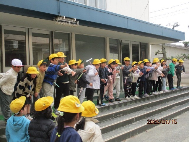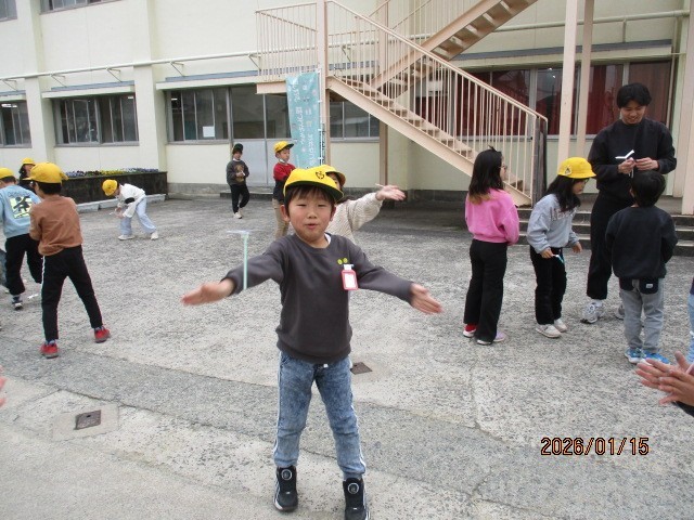 1年生は、自分たちで作った紙の竹とんぼを飛ばしました。羽に色を付けていたのですごくきれいでした。みんな上手に飛ばしていましたよ。