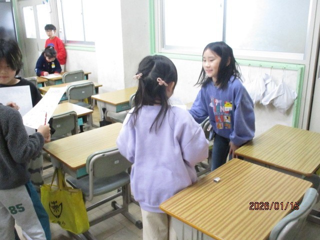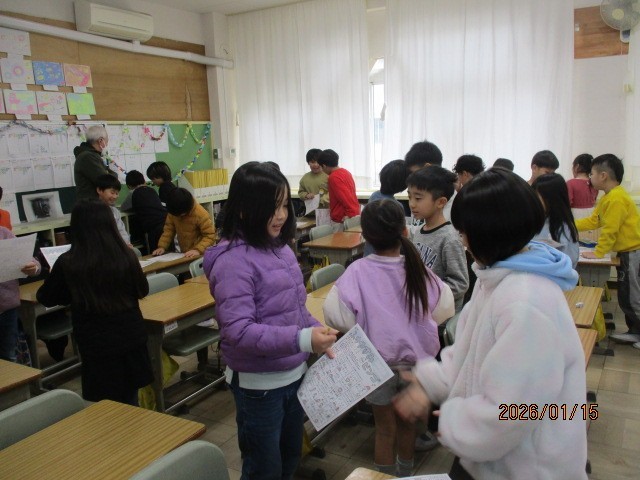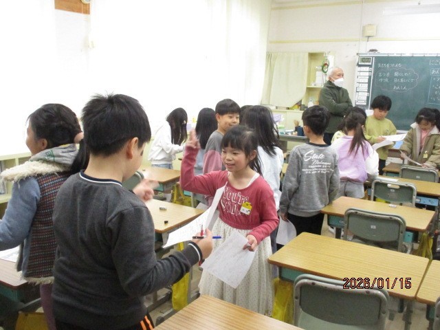 2年生は、「ほっとcom」で「ふゆやすみビンゴ」をしました。相手を見つけて、「おみくじひいた?」とか「お年玉もらった?」とか「ダラダラした~」とか、聞きます。答えられたらその項目をチェックし、縦横斜めのどれかがそろったら「ビンゴ」です。