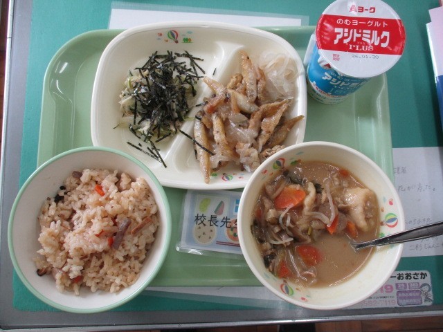 大分県の「とりめし」、秋田県の「きりたんぽ汁」、茨城県の「ワカサギの甘酢」、京都府の「水菜の海苔風味和え」という郷土料理の献立でした。