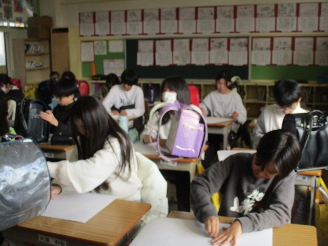 6年生は、6年間お世話になったランドセルの写生をしています。じっと見ると、6年間の様々な思い出が頭に浮かんでいます。