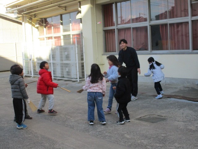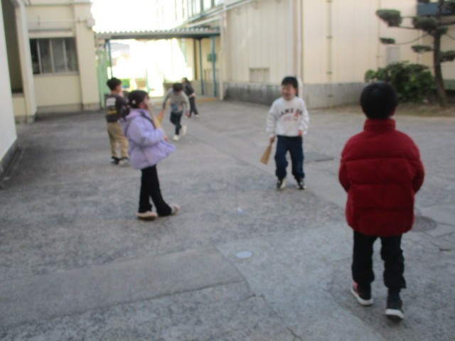 1年生は、生活科で昔遊びをしています。今日は、羽子板をしました。なかなか続かせるのが難しいです。