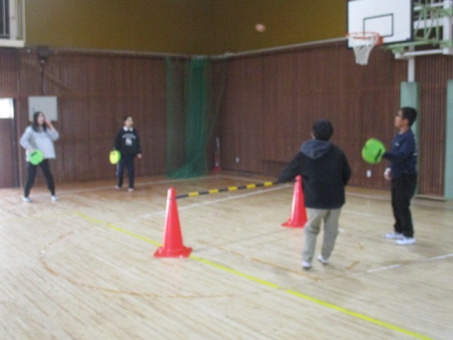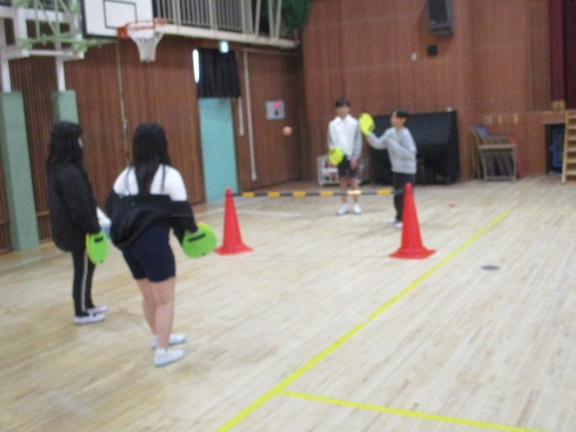 テニピンは、テニスの楽しさを誰もが体験できるように、用具とルールを工夫したネット型ゲームです。中央小にはそのセットがあるので、体育でテニピンに取り組むことができます。まずは、続けることができるように練習です。