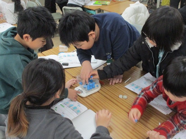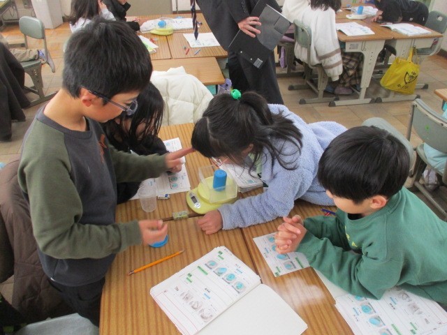「重さ」の授業です。新しい粘土を容器から出して重さを測ります。その粘土を皿のように伸ばしたり、ひものように長くしたり、玉をいくつも作ったりして「重さ」が変化するかどうかを実験しました。「重さ」が変わると思っていた子も3分の1くらいいたので、実験をして変わらないことがわかりました。この時間は、教育委員会の先生も来てくれて、先生と子どもたちとの良好な関係や子どもたちの頑張りをほめてもらいました。