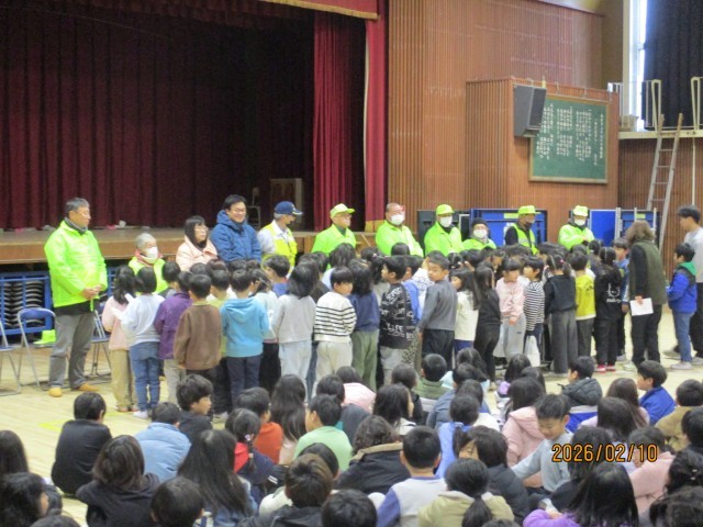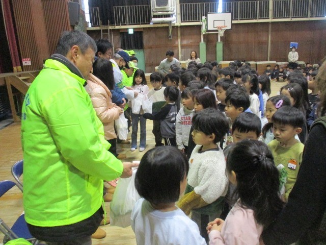 見守り隊の隊長さんからお話を聞きました。見守り隊が20人くらいいること、あいさつをしてくれたらうれしいこと、命を守るために黄帽をかぶろうという話をしてくれました。そのあと、1年生が一人一人お花のプレゼントをしました。