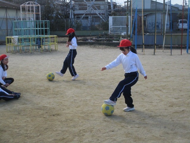 2月の体育の授業はサッカーです。はじめに、ボールに慣れるところから始めました。そのあとは、二人一組のパスの練習です。
