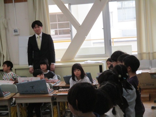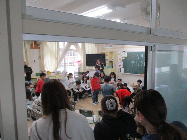 1年生は、この1年でできるようになったことを発表しました。こまやけん玉、木琴や計算カードなど、グループごとに発表しました。そして、最後に自分たちのがんばったことを声を合わせて発表しました。