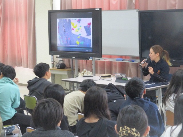 6年生は、三度目のゴリラパークの方との出会いです。今日出会った西村さんは、主にパラクライミングのサイトガイドをしているそうです。パラクライミングは視覚障がいや身体機能障がいのある選手が、高さ15mの人口壁を登り、到達したことろの高さを競う競技です。そのサイトガイドとは、視覚障がいのある方に突起物の位置や形状、登るルートを言葉で詳細に伝え、壁を登るサポートをする人のことです。西村さんは、「仕事は今まで生きてきた思い」と言って、いろんな仕事をしてきたけれど、人を笑顔にすることに変わりはないと言っていました。