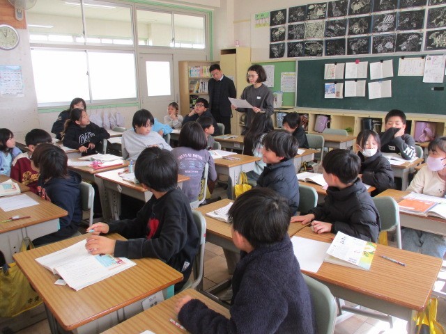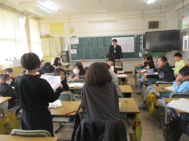 今日は、神前先生の授業を教育委員会の先生が見に来てくれました。子どもたちが本当に頑張って、発言する人の方をしっかり見て聞き、自分の意見もしっかり言っていました。教育員会の先生にも「子どもたちがよく頑張っていましたね。」とほめていただきました。